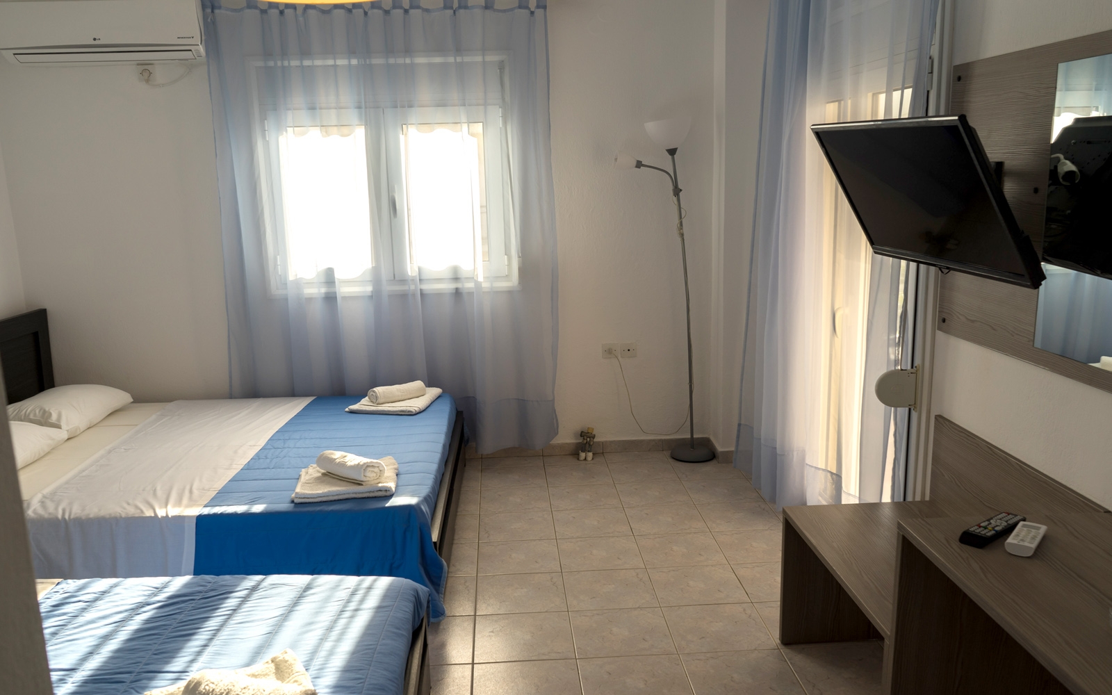 Your stay inside our luxurious double Polykratis room is supported by a very high efficiency adjustable air conditionig system that controls in the best way the temperature for you.